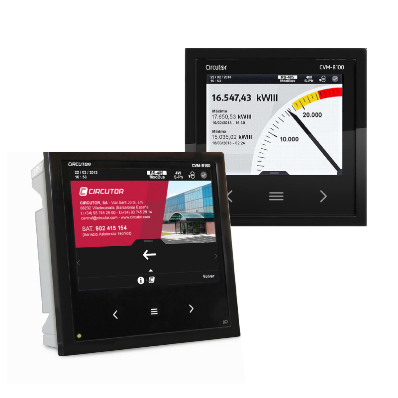 The CVM-B100 and CVM-B150 units are panel mounted three-phase power analyzers (dimensions: 96x96 and 144x144 mm, respectively). Both offer 4-quadrant measurement (consumption and generation). Suitable for Medium or Low voltage installations, in both 3 or 4-wire three-phase circuits, two-phase circuits with or without neutral, single-phase circuits or ARON connections. The CVM-B100 and CVM-B150 high-performance units feature a measurement engine that allows the user to analyse many different electrical parameters, in addition to offering a large variety of optional expansion modules for the same unit.